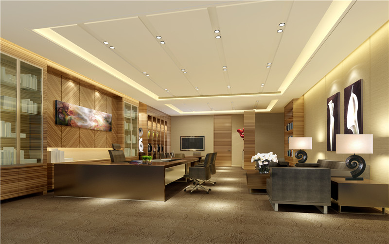2)辦公室也可以給人的是一種高檔、豪華的感覺。白色的石膏板吊頂搭配黃色的微晶石背景墻顯得非常的和諧,整個辦公室在暖黃色的燈光照耀下顯得非常的奢華,大氣,展現出公司的實力。